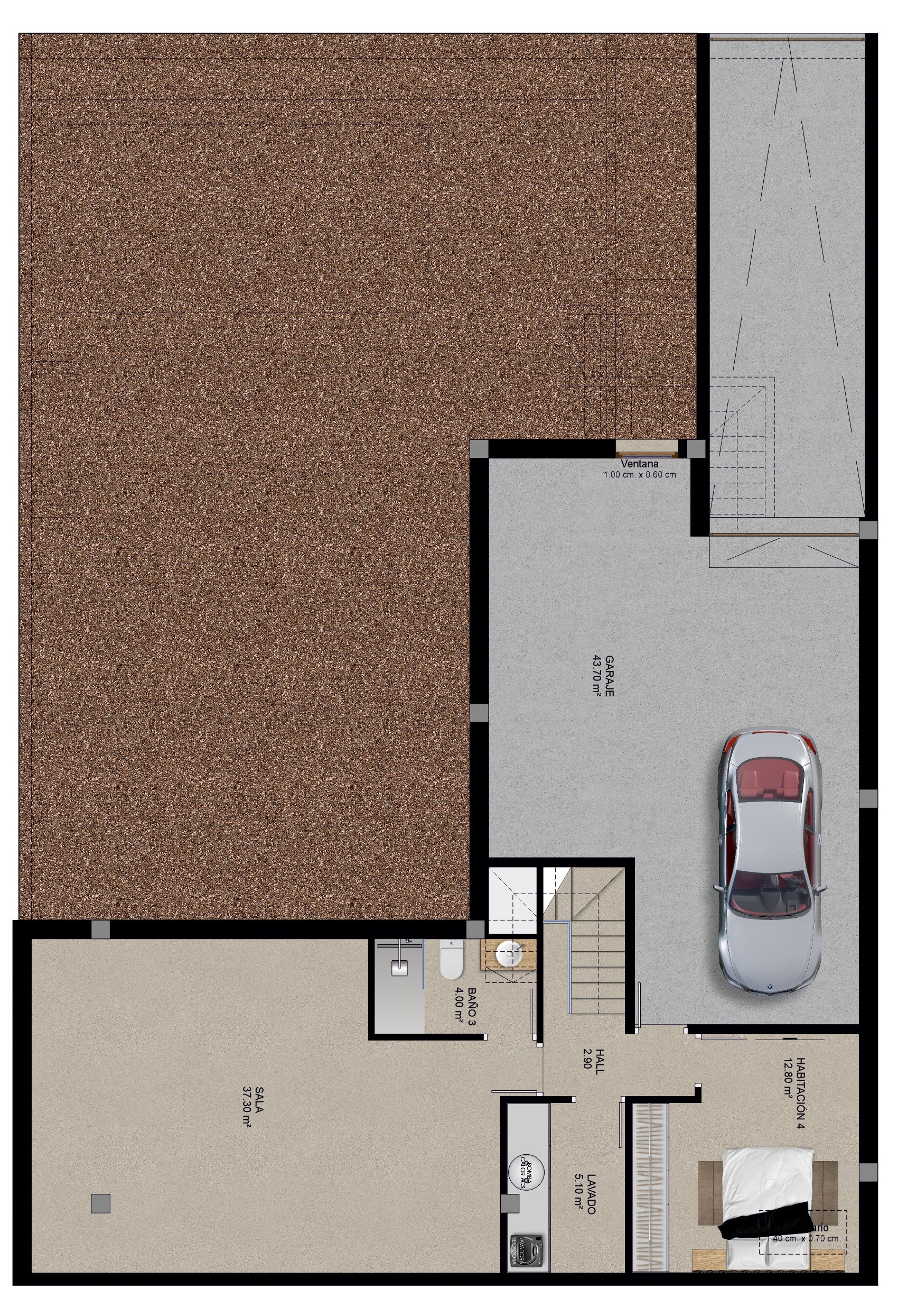 Incluye rampa, garaje, cuarto de limpieza y escalera interior para acceder a la vivienda. Los dos espacios restantes visibles en el plano se entregan en bruto, sin acabados adicionales.